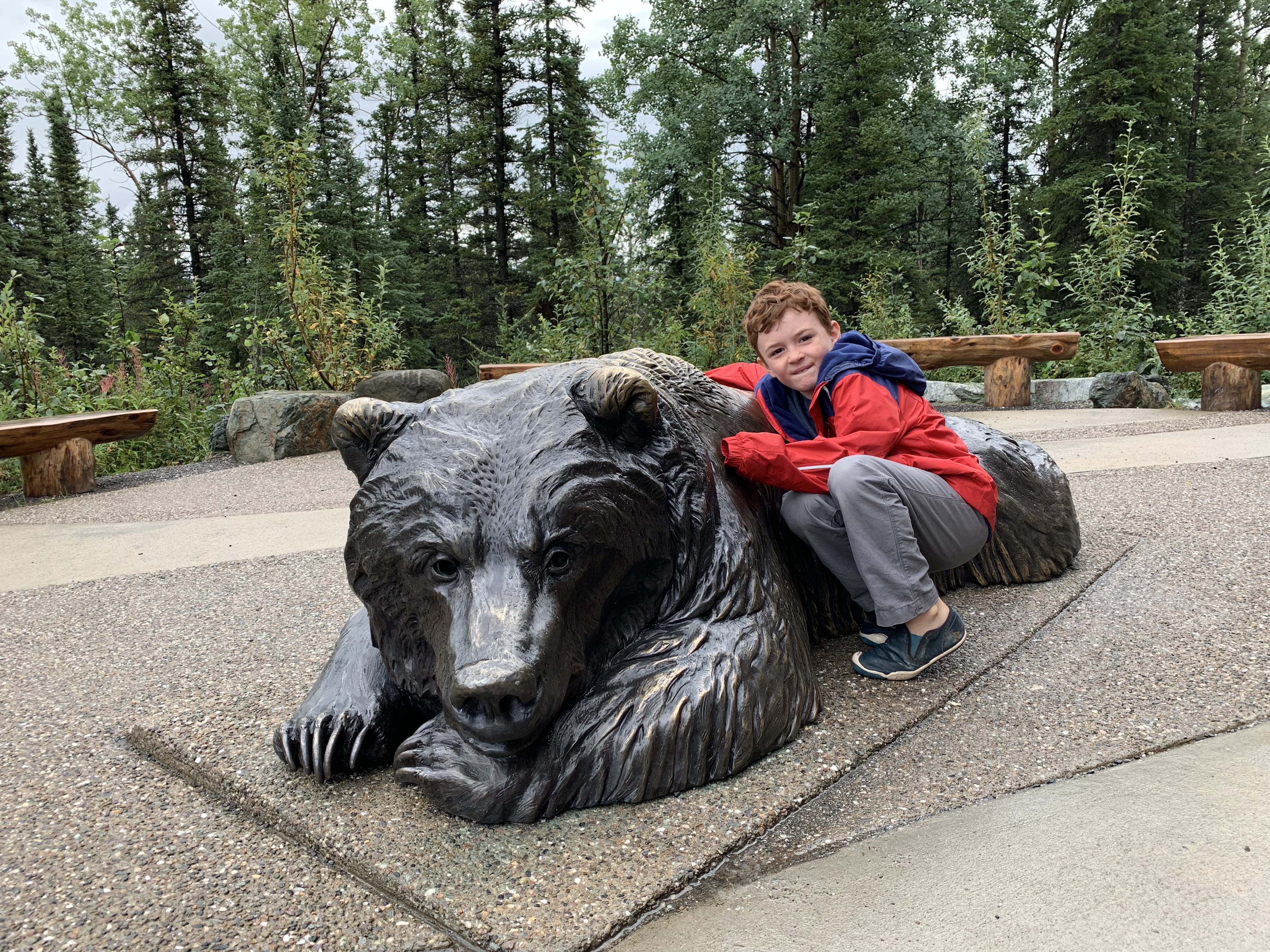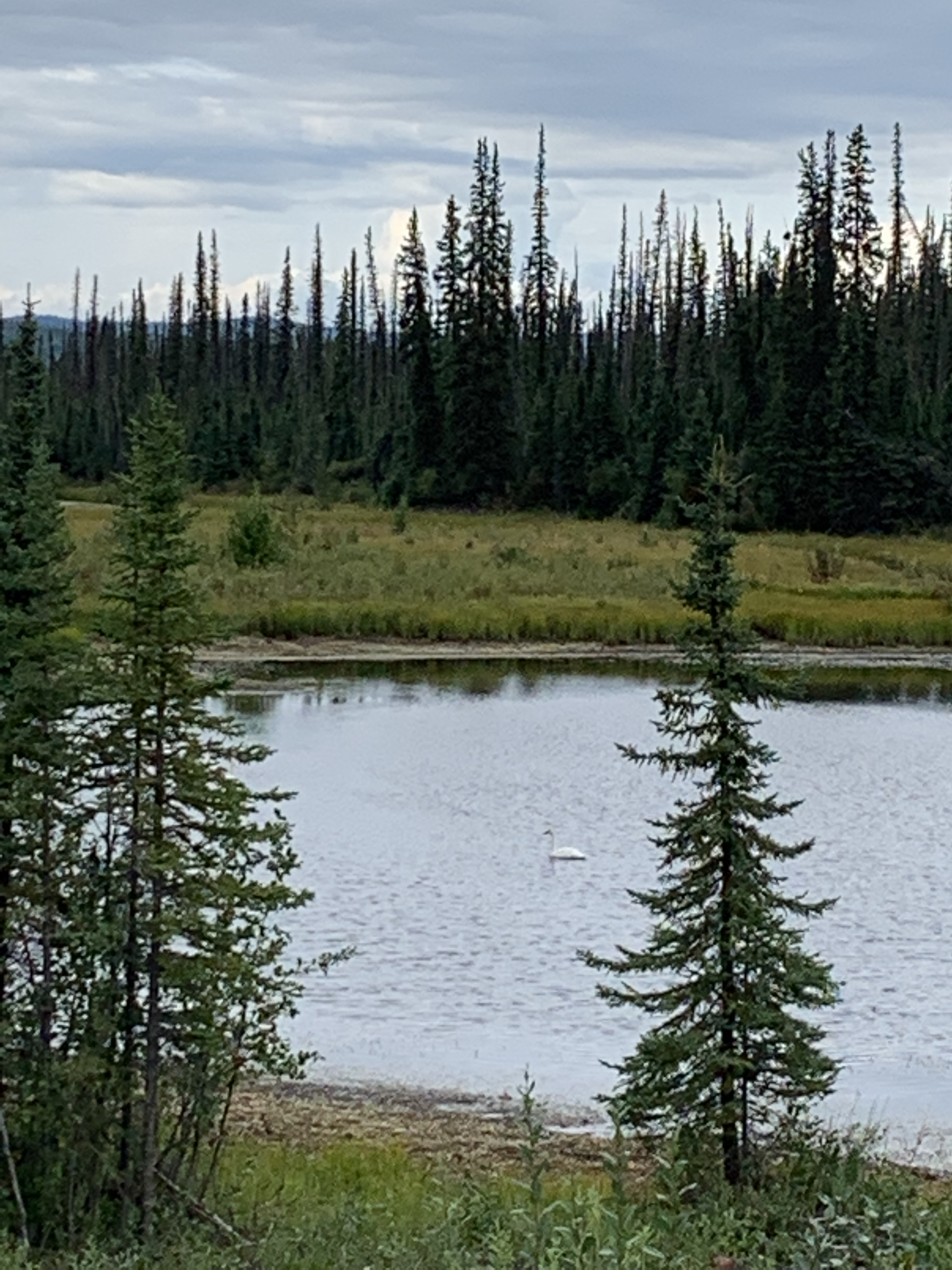 He was a great trooper traveling in the truck all those long hours,,,,,,total we were on the road 11 days…..we did stay two nights in Fairbanks and then in Stewart, and he asked if were were staying another night at both our boondock camp sights, but had to break the news that we weren’t. Found a beautiful campground south of Prince George at a Provincial Park, as they call them, that had lots of great amenities, electric hook up for our freezer, swim beach, which Pax waded out in and I finally joined him after he had asked me (again), rows and rows of picnic tables along the swim beach in the trees, a huge and I mean huge green space with a fun playground for kids and a changing cabana, bathrooms were a bit of a walk away, but nothings perfect!!!! π π