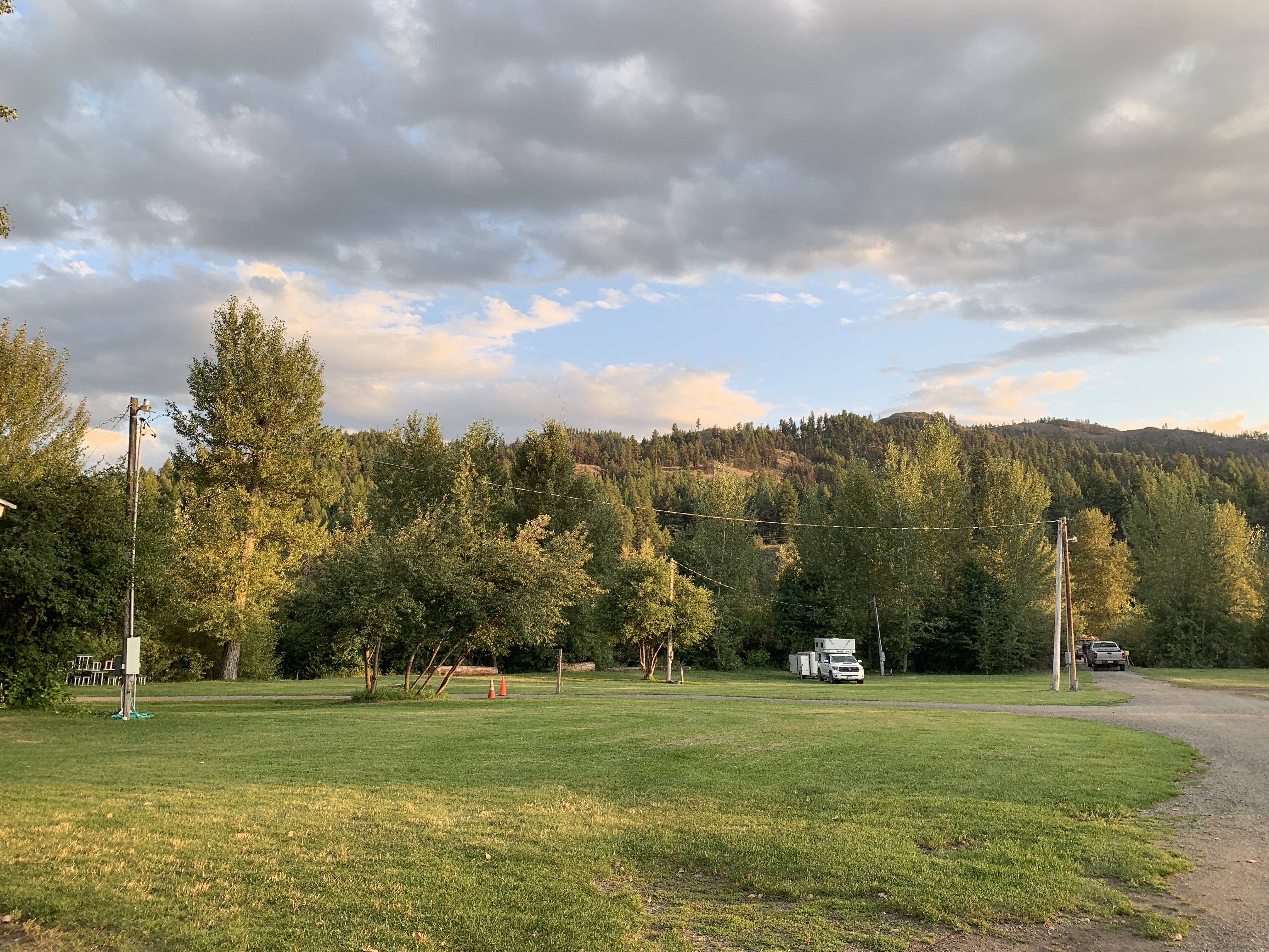 Getting late by now well after 4pm. after finally crossing the border and we are wanting a camp spot…….thought we’d even pull into a private campground but the towns in this part of WA are small……kept driving south then east and settled on Republic after I looked up on an app (All Stays) a spot at their fairgrounds……and what a beautiful facility it was……..it remained us our how ours used to look, wooden structures, wood barn like our exhibit hall use to be…….a race track, they still have and use theirs!!! Wooden bleachers………all on 44 acres.