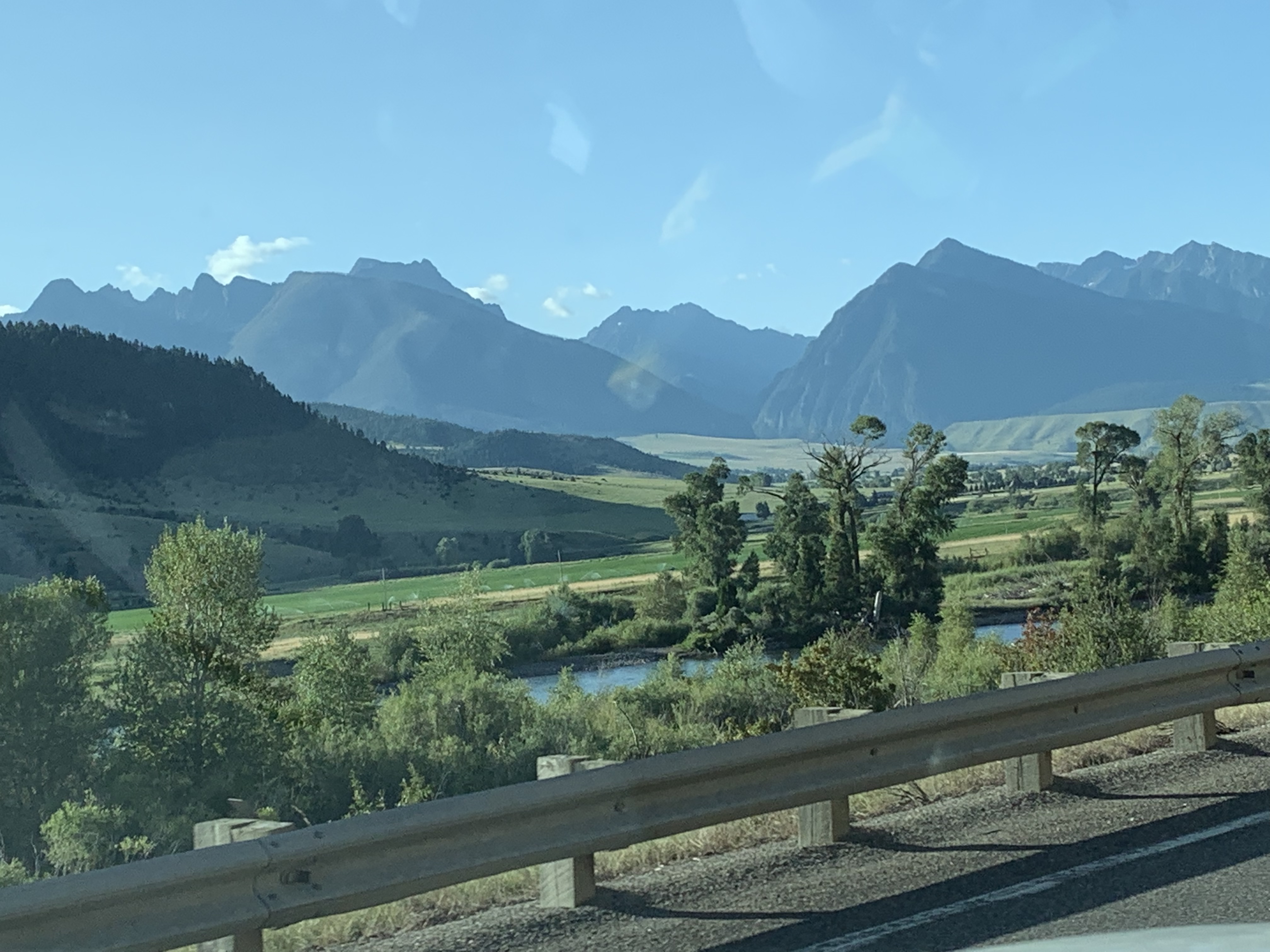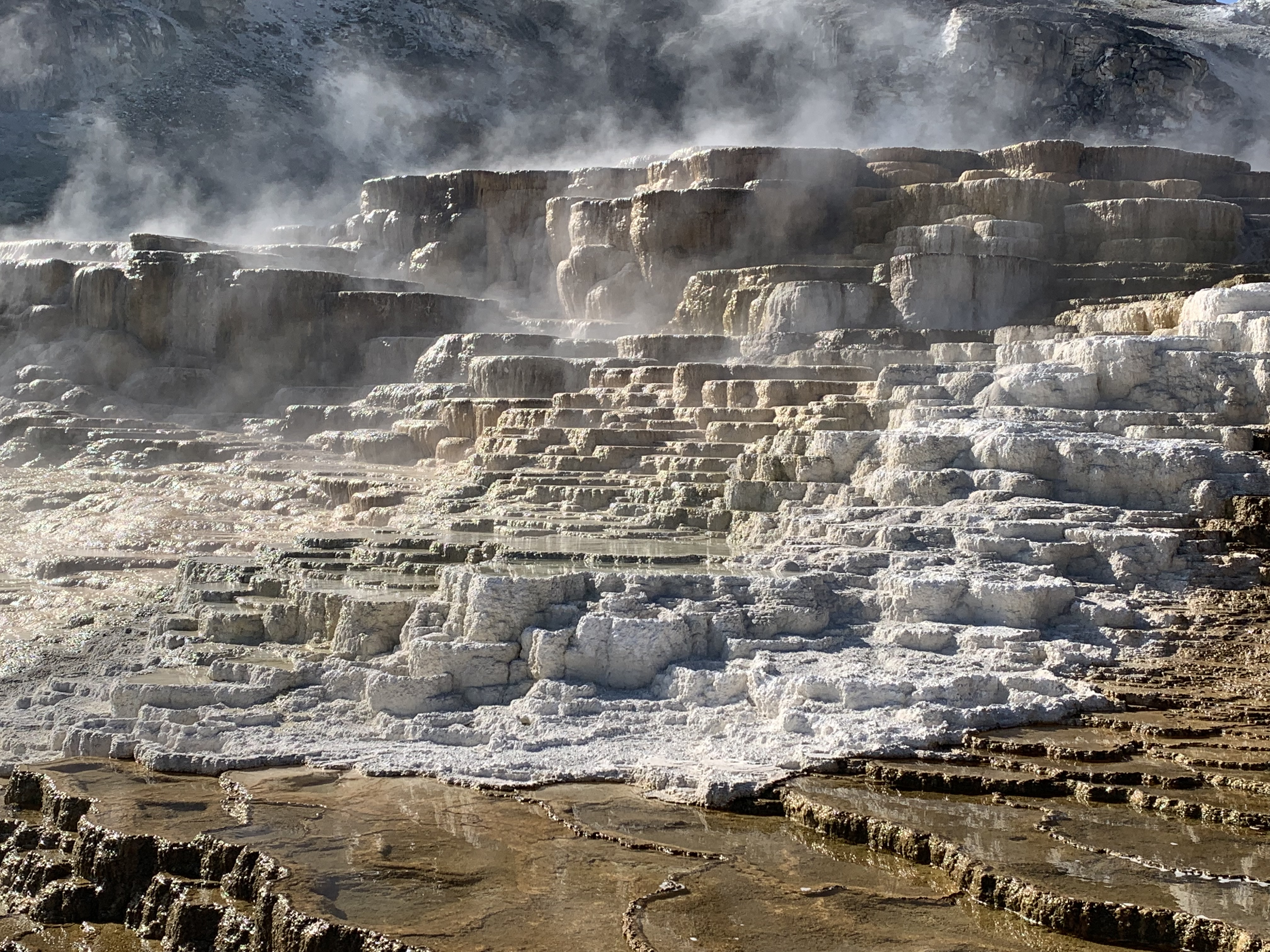 Traveled east a bit, then south passed through Spokane, east on 90, oh boy northern Idaho is up down up down up down up down in the mountains and that is no exaggeration!!! lovely county,,,,,,,,Butte MT, KOA most expensive place, right next to interstate, all well, and then south into Yellowstone for Pax……I did get to see Mammouth Hot Springs, it was lovely,,,,,,,,The Grand Prismatic Spring was too, too, too busy wasn’t worth stopping and even walking in,,,,,,,,finished off at ol’ Faithful and Paxton throughly enjoyed that,,,,,,If we ever stop there again got to remember you can take your dogs around that whole area…..Cliff stayed in the truck with them after letting Henri pee on lots of tires……… π π π