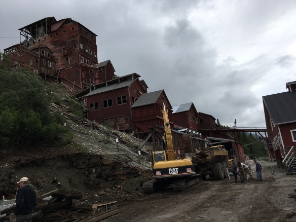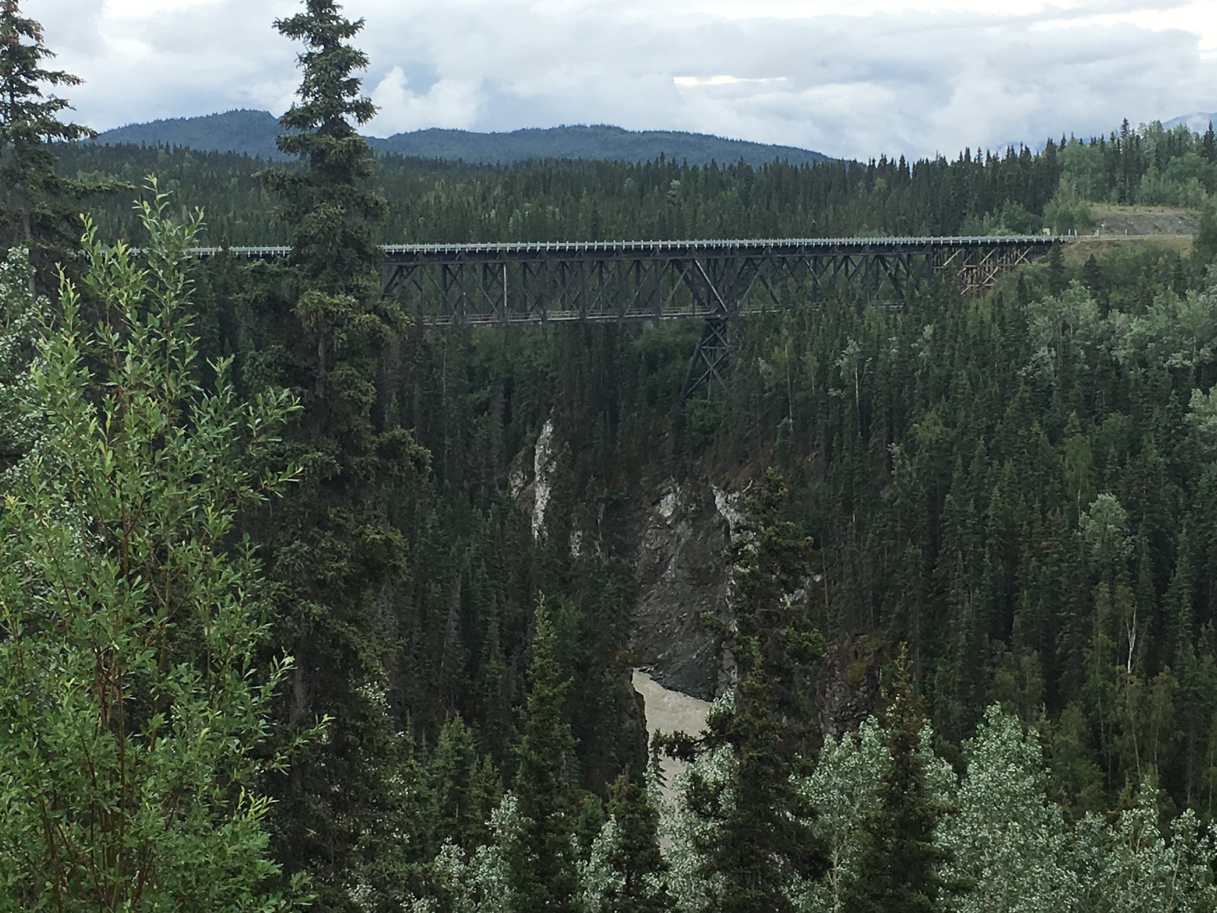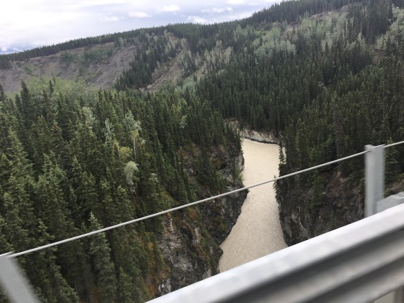 The reason we are in the boondocks is Kennecott mine! Cliff loves history and old mine stuff, I love old buildings and scenery! So a 60 mile dirt road trip @ 15-25 mph later we made it!!! Yes that fast only and we mean it! Being a well seasoned back country driver from Colorado we know what we are talking about!! Haha. Sorry about the bragging!! But some of you remember the Letoux creek road before the turns it into a dirt/ gravel highway!! We know rough!! So it was worth the slow drive they have mile post so you can see you progress!!! And sometimes you didn’t want to know ‘ that’s all we’ve gone?!!’ Haha. The scenery was great even tho it was cloudy ‘again’. We crossed over an old rr bridge 248 ft. Above a river. The railroad bed was used for parts of the road into McCarthy!
