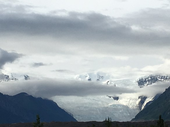 So the weather was very good yesterday for mountain viewing, because when we came into Palmer over three weeks ago it was low clouds and rainy…..So we were blessed there!! Today, Saturday the 8th, weather app. and it’s proved it 100% chance of rain today here in Valdez. No mud tho, sandy soil and grey chopped rock, like our red path rock at home…..we are getting a taste of our camper very close quarters style today. Doing well, got the table set up, half of our stuff in the truck, and we are snug as a bug!! Oh and a first, we are hooked up to electric. Have had this camper for a tad over 3 years and never used electric at a campsite, just at home to get frig cold. So can use computer lots and charge all camera batteries and phone, or and not worry about frig, we have some halibut in the freezer couldn’t fit it all in when we shipped some home. Had our first taste Thursday evening, foil wrapped it with onions and butter!!! Yum, less cooking time next time is all I need to change!