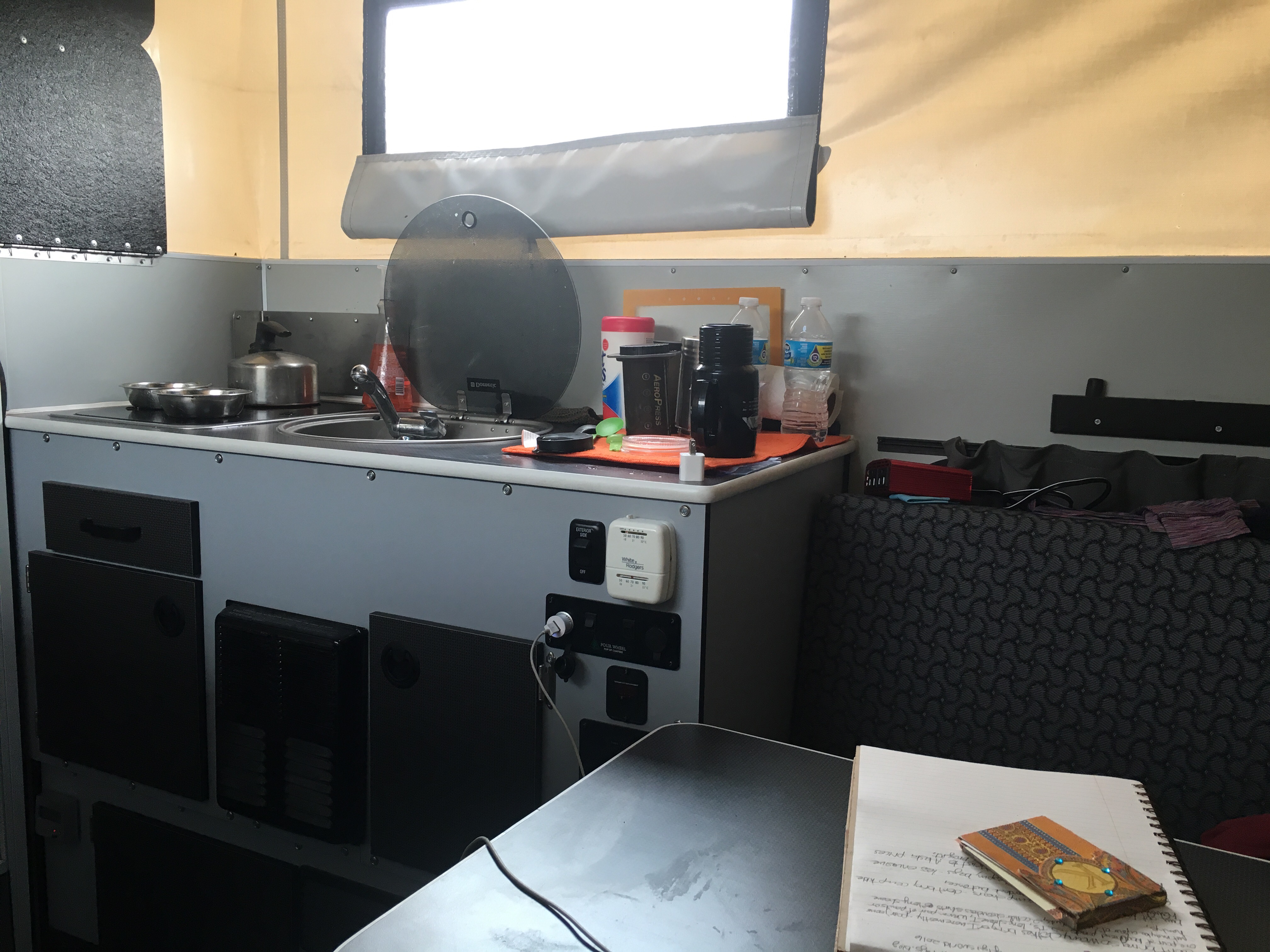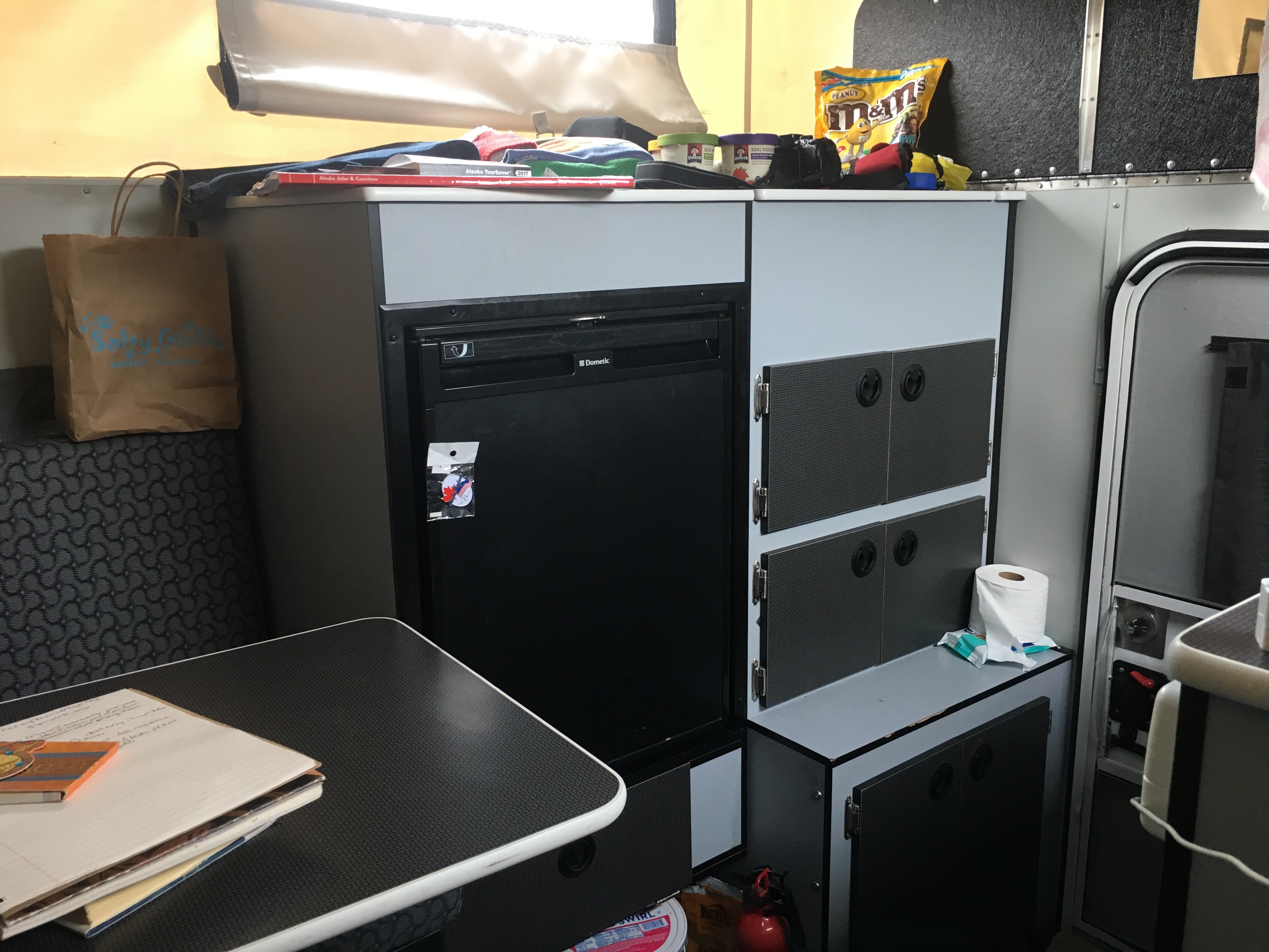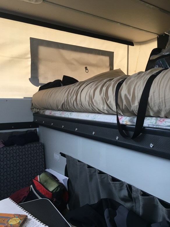 I’ll post pics of our ‘space’ so you know what I’m talking about!! We don’t live ESP. In these small/tight quarters like Martha Steward so……. haha. But I loved it because we used to sleep in the truck bed with a camper shell on inflatable single air mattress 3″. Now I have a kitchen, dinning room, bedroom!!!! And a cabinet for a porta potty so a bathroom too!!! Shower is outside, got a flip open easy tent for that!! Our bed is a queen size on that slides into a double so we can sit at the table!!!