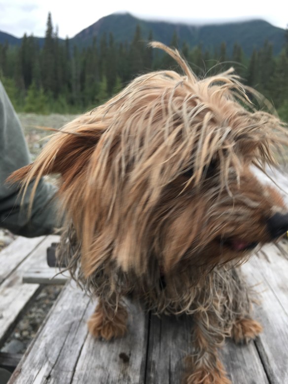 I may get an ipad for next trip, then I could have it easily on lap or in front with me and type stuff as I think of it, this is jumping around I apologize!!!! Coming down from Talkeetna we turned left to head to Hatcher Pass, so we by passed Wasilla! I did that same exact drive with Amy 10 years ago! I had forgotten just (hear I go again) beautiful Hatcher Pass was!!!! Last time was in September, golds, reds, some greens, you know fall colors!!! this time of course it’s July and all of Alaska has been getting rain so very green. Over the top of the top and down another very steep grade bet it was 10% at least, is a state park, Independence Mine gold also! It was up and running in the 30’s even, lots of buildings and some had been refurbished. Nice hiking, Oakley loved it, she knew she was in the mountains and on a hike!!!! Henri was happy to just be out and about, Oakley was happy he was happy!! Cliff panned for some gold in two different spots and one pan had some gold pd. he got a rock that looks like what you find gold in in Colorado and there is a speck, so got a souvenir. 🙂 🙂