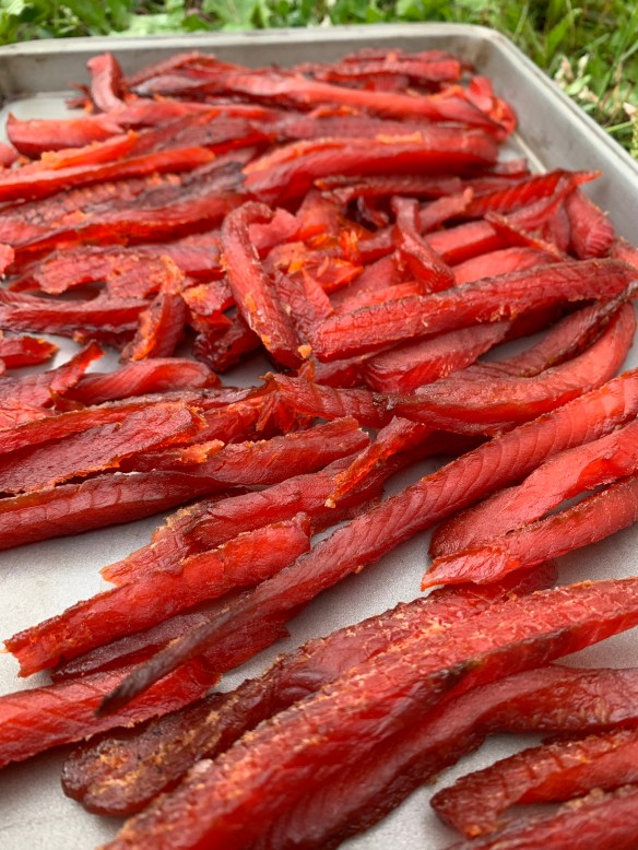 Well we smoked strips of salmon today after deboning it and slicing it and skinning it last night and marinating it for 12 hours or more…..and YUM-O…….. it smells delicious too! I apologize for this delicious post maybe if we do this at home and you read this ask for a taste and I’ll give you one!!!! ππππΌ